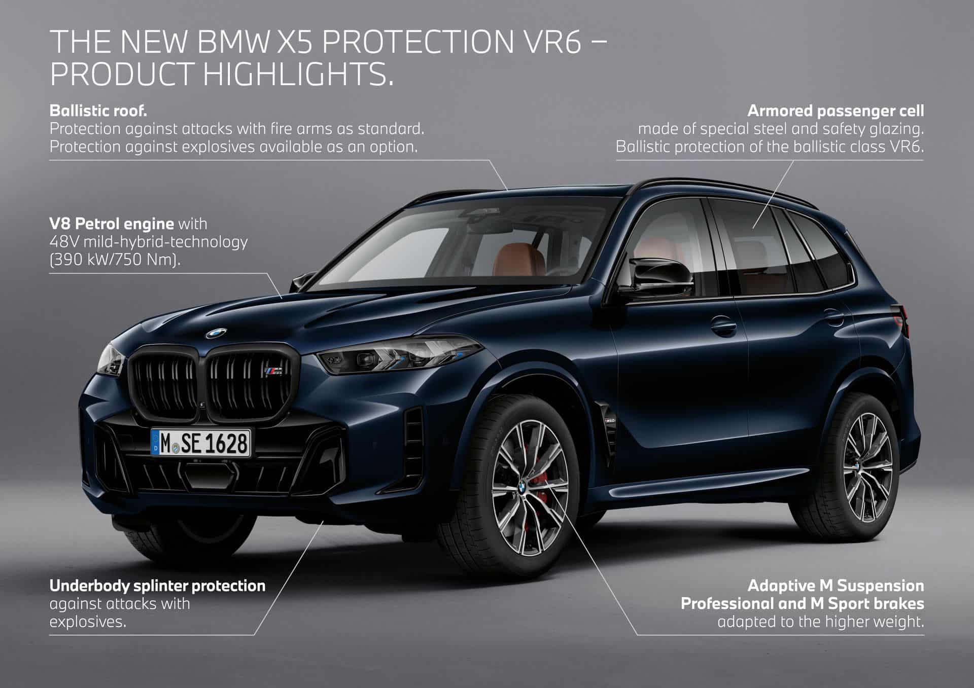 It was only a few weeks ago when BMW introduced the 7 Series / i7 Protection and now another armored vehicle is breaking cover. The X5 Protection VR6 is a familiar face, having been introduced four years ago, and it’s now getting a Life Cycle Impulse. The German luxury marque wants to bring the tougher version in line with the recently updated conventional X5. The X5 Protection VR6 continues to be based on the M Performance model, but much like the not-quite-M X5 LCI, it transitions from the M50i to the M60i moniker. At the heart of the revised armored model is the newly developed S68 engine, a twin-turbo 4.4-liter V8 with 530 horsepower (390 kilowatts) and 750 Newton-meters (553 pound-feet) of torque.