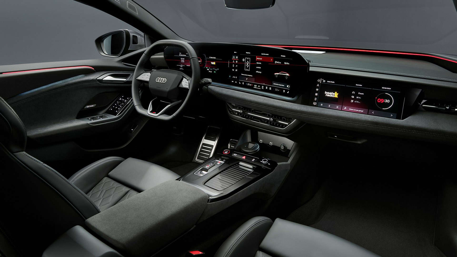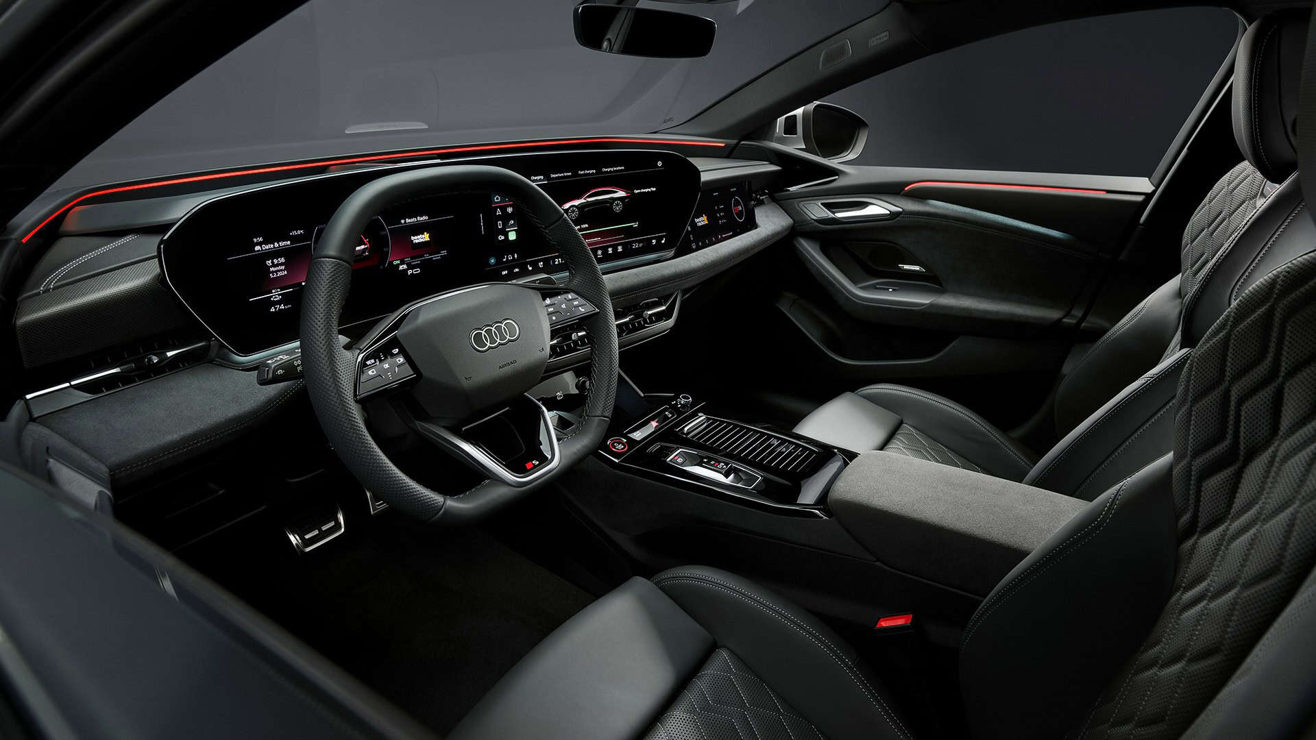 Inside, there’s a screen-heavy dashboard with an 11.9-inch driver’s display, a 14.5-inch infotainment, and an optional 10.9-inch screen for the front passenger. On top of that, customers can order the car with a new generation of Audi’s head-up display featuring augmented reality tech. Speaking of things that cost extra, the panoramic sunroof takes advantage of polymer-dispersed liquid crystals (PDLC) to switch from opaque to transparent at the touch of a button.