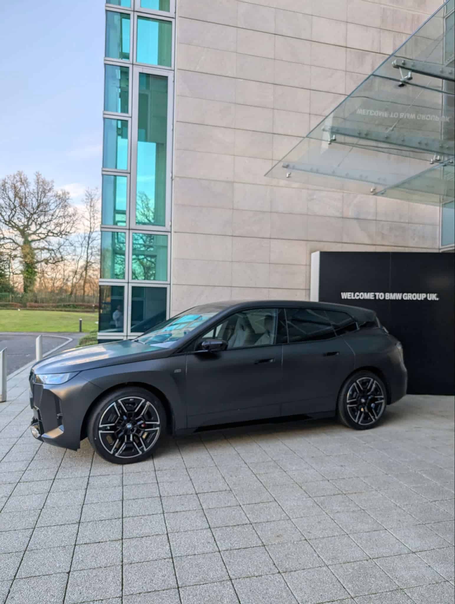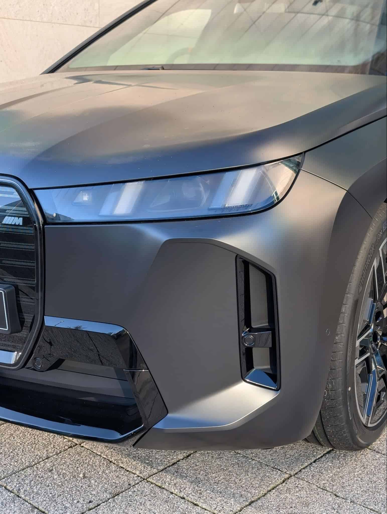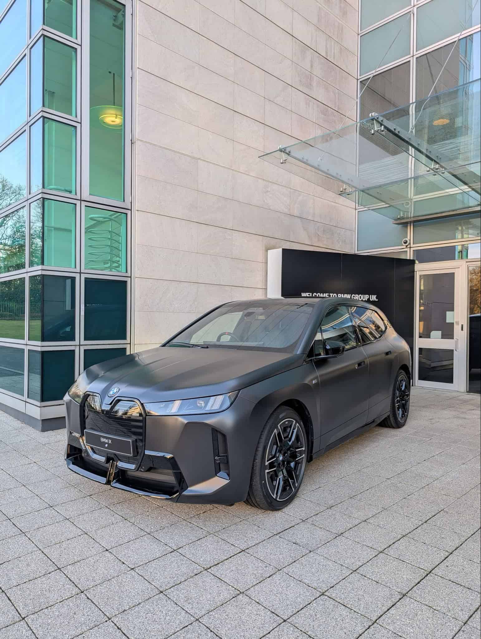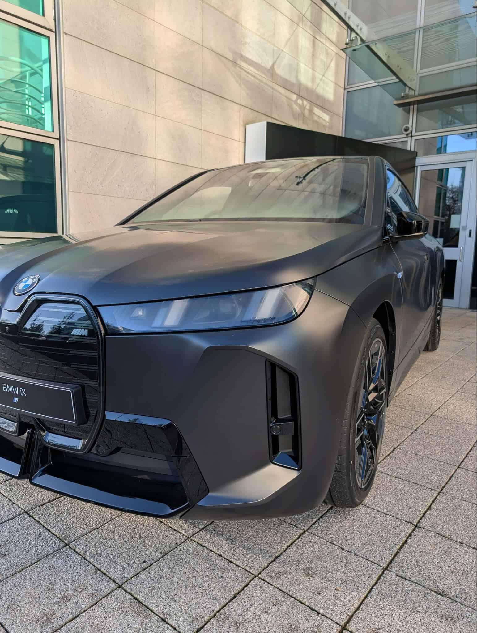 Mere days after its world premiere, the iX facelift is already proudly displayed in front of BMW UK’s headquarters. As you can easily tell, it’s no ordinary version of the polarizing SUV. In addition to being the hot M Performance model, it’s dressed to impress in Frozen Black. It’s a pricey matte finish from the Individual catalog. The heavily darkened Shadowline headlights are standard on the iX M70.
