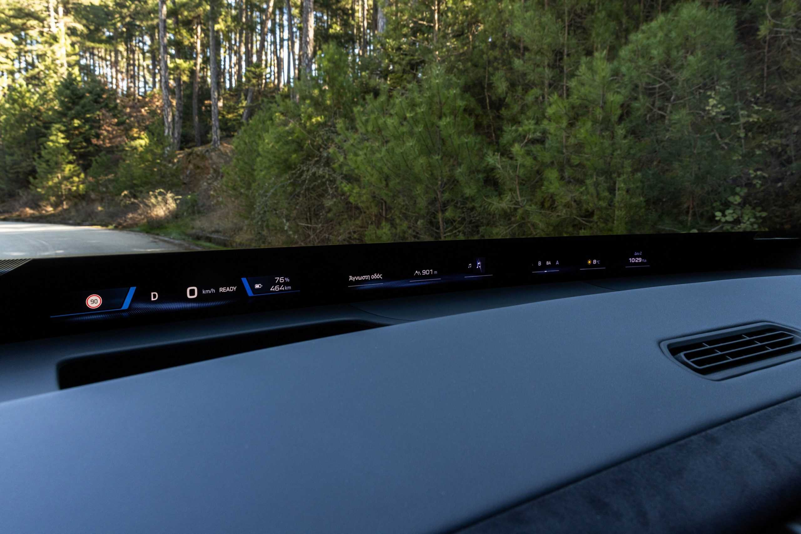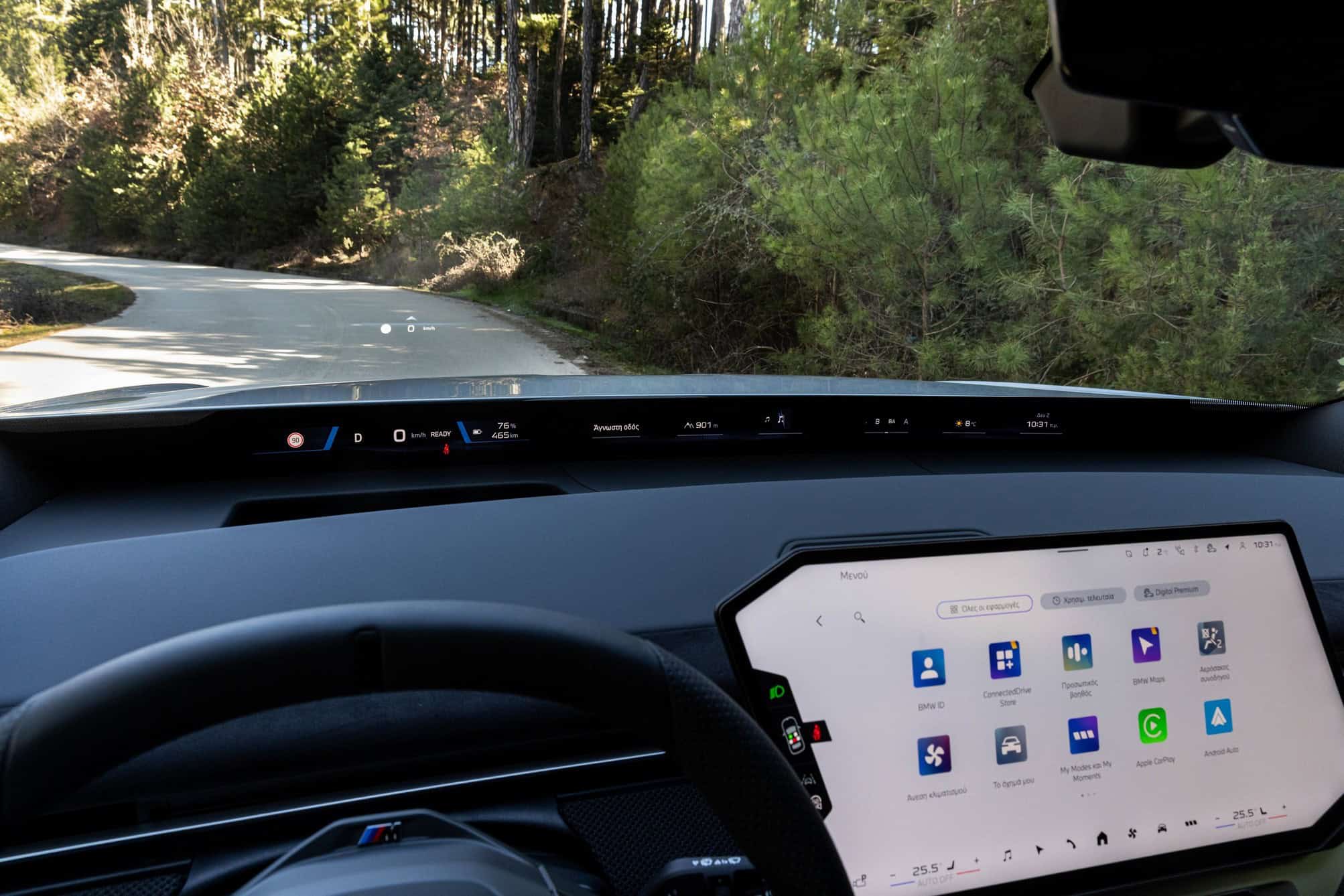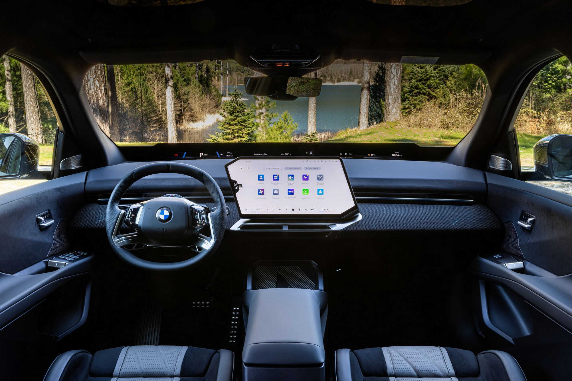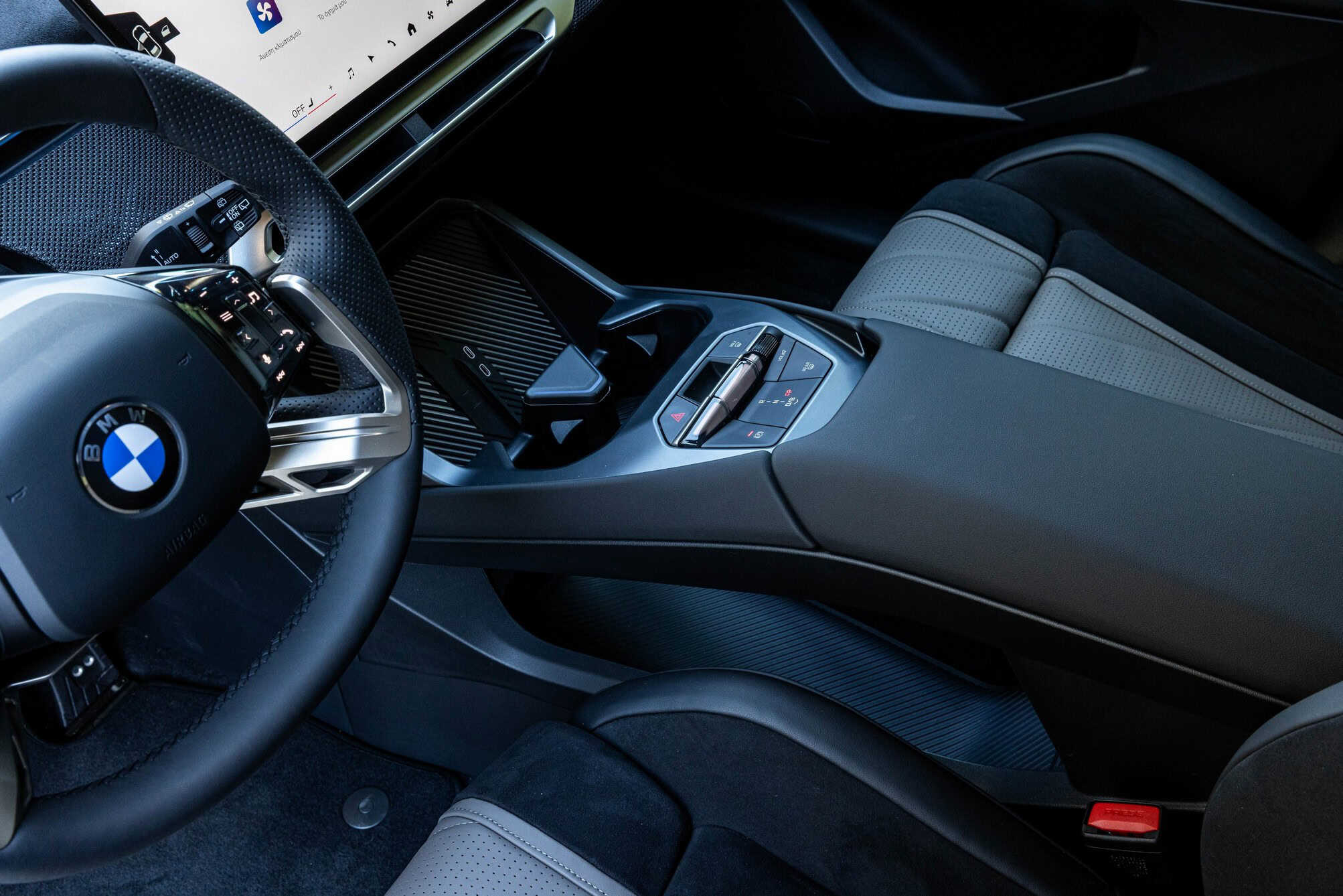 The iX3 highlighted that BMW Greece has an Individual leather interior with a seat pattern finished in white and dark blue. It’s worth noting the upholstery does appear in the configurator, but only in a much darker Adelaide Grey finish. These lighter tones elevate the cabin, and it also helps that this configuration has plenty of M trinkets. The bluish notes extend onto the suede-like material covering parts of the door panels and dashboard.