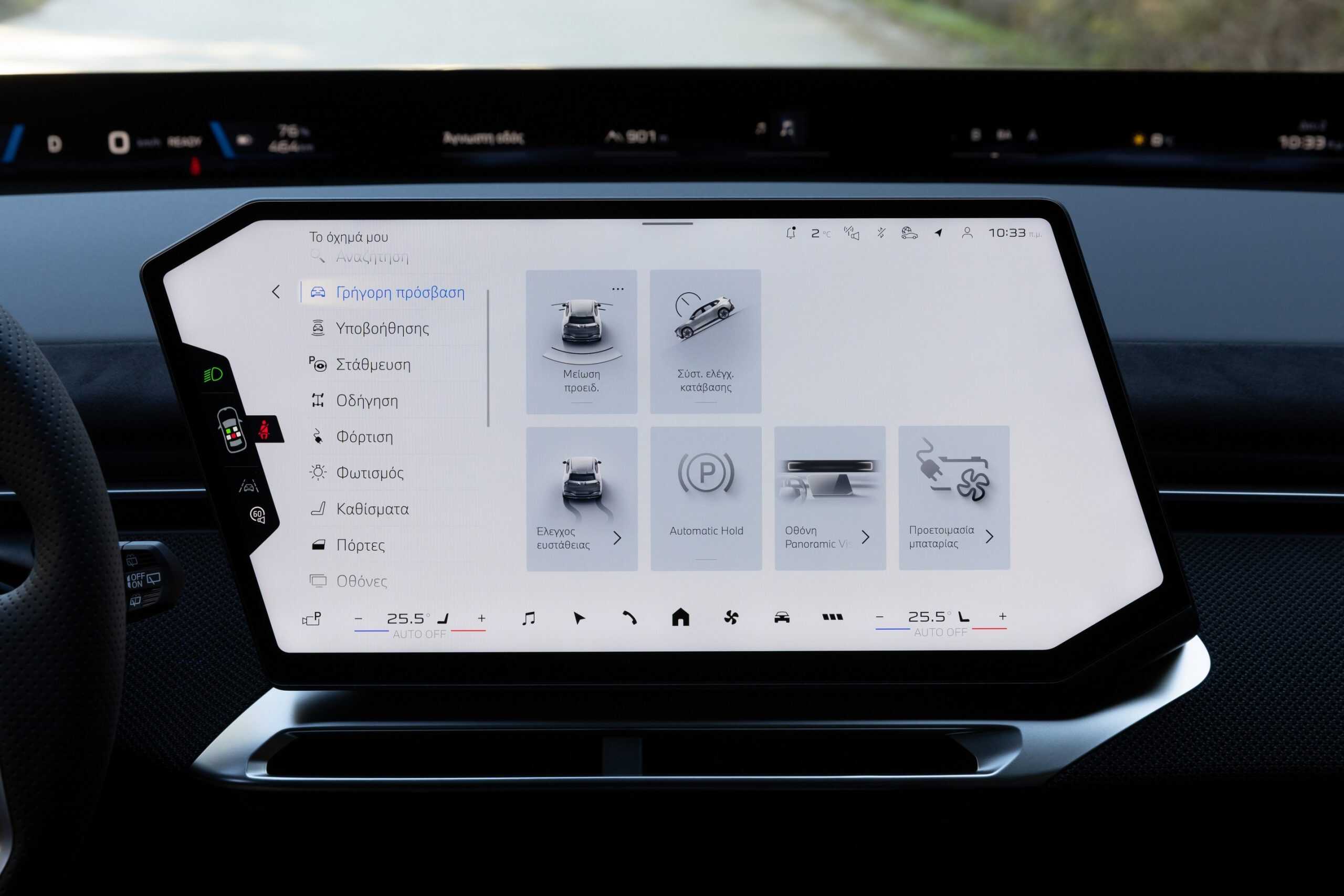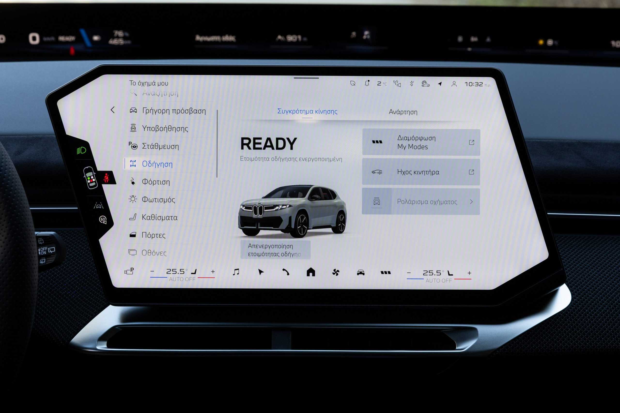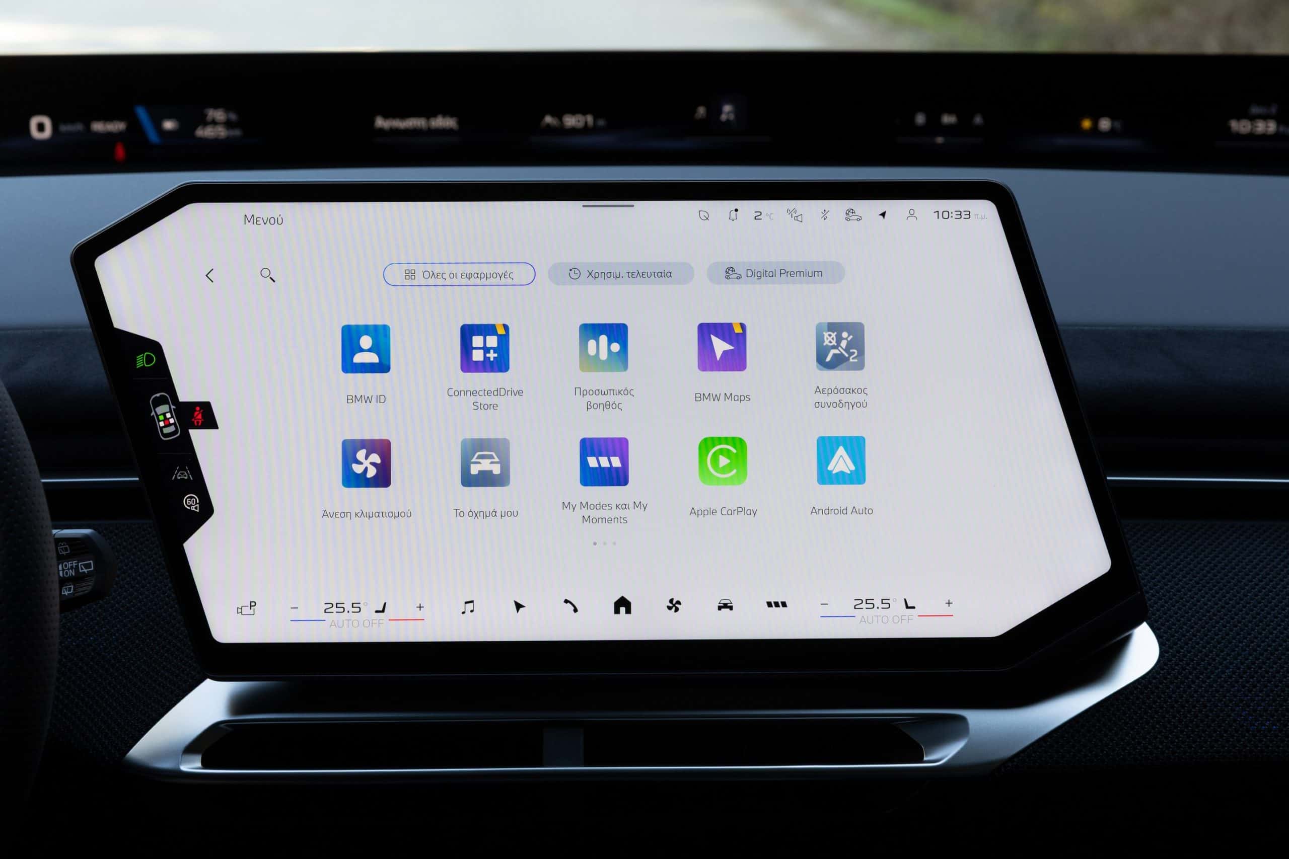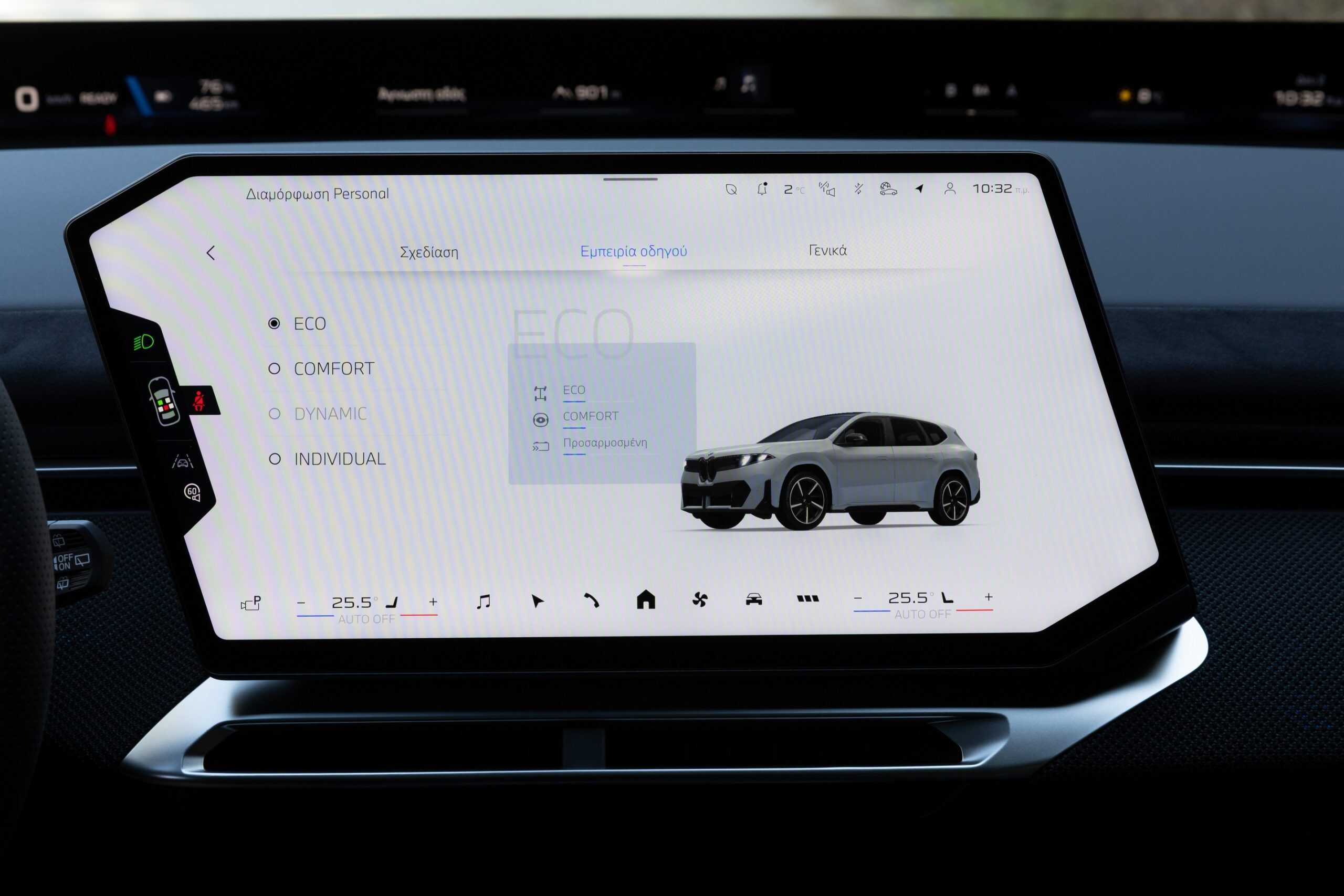 The iX3 highlighted that BMW Greece has an Individual leather interior with a seat pattern finished in white and dark blue. It’s worth noting the upholstery does appear in the configurator, but only in a much darker Adelaide Grey finish. These lighter tones elevate the cabin, and it also helps that this configuration has plenty of M trinkets. The bluish notes extend onto the suede-like material covering parts of the door panels and dashboard.